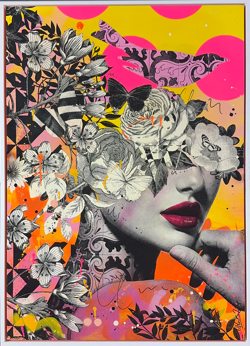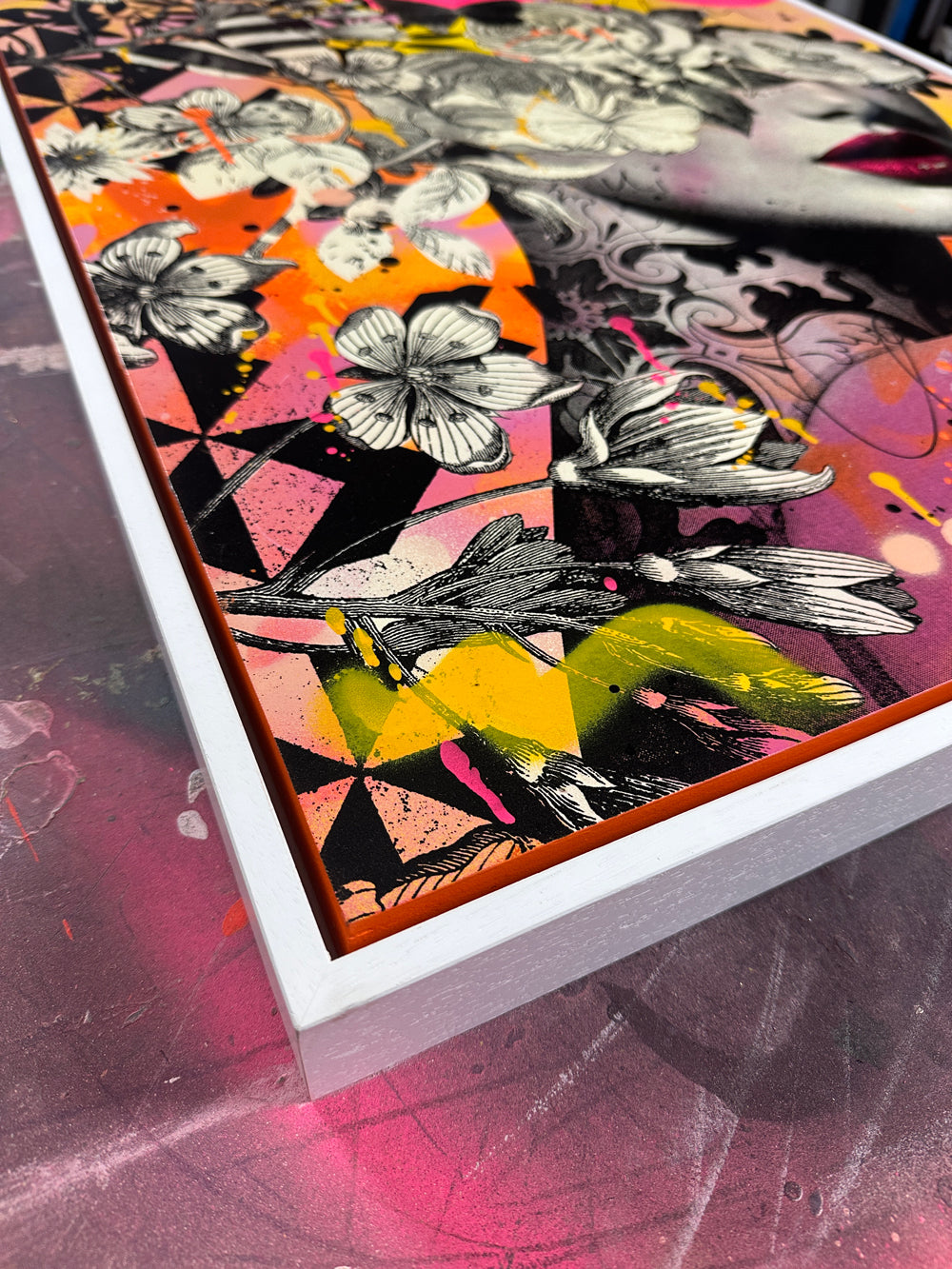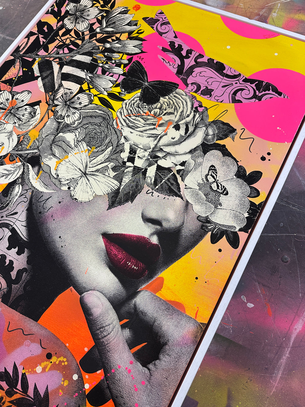 Acrylic, spray paint, silkscreen & varnish on circular panel